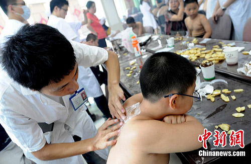 一名少年患者在家人的陪同下来到该院院接受“三伏灸疗法”治冬病。刘可耕 摄