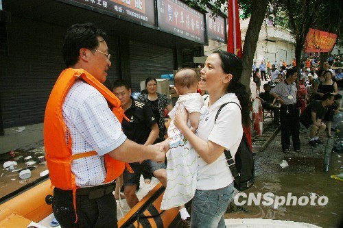 7月19日,被从洪水围困中营救上岸的群众,与广安市抗洪抢险工作人员亲切握手以表谢意。中新社发 杜修战 摄