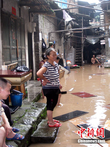 19日,重庆渝中南纪门下伍家巷居民房门前被洪水淹没。周毅 摄