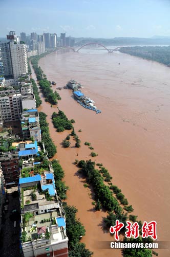 7月19日,重庆合川滨江路被淹。受上游连降暴雨的影响,从7月17日开始,合川区境内涪江、渠江、嘉陵江水位急速上涨。截至7月19日下午16点,合川境内渠江罗渡水位达224.98米,超警戒水位8.89米,超保证水位5.89米。中新社发 李江全 摄