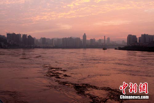 19日晚8时许,12年来最大的长江洪峰过境重庆。江水几乎与滨江的路面持平,在晚霞的映射中,出现江水拥城而来的景象。 郭虹 摄