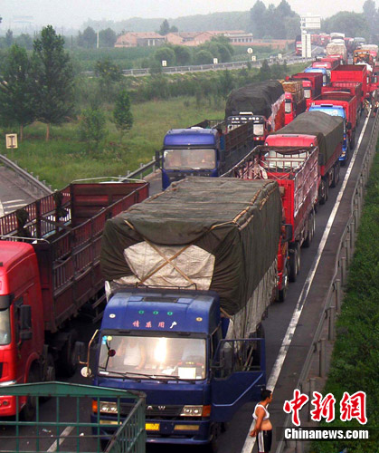 河北省公安厅高速交警总队7月19日透露,京藏高速河北内蒙古省界遭遇梗阻,目前大量车辆滞留在河北段,日均堵车30余公里。据该省高速管理部门介绍,内蒙古自7月15日起在京藏高速对5轴(含)以上货运机动车实施单双号分流以来,车辆通行缓慢,堵车严重时车辆滞留达70余公里。图为京藏高速进蒙方向堵成长龙的车流。中新社发 翟羽佳 摄