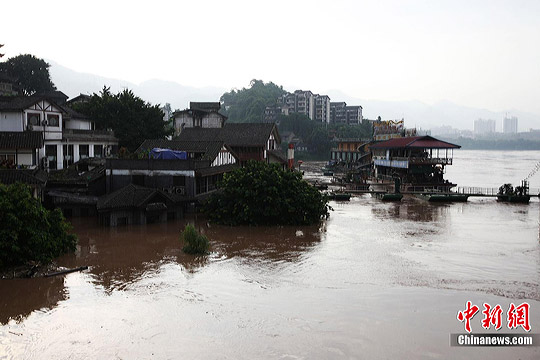 7月19日,今年入汛以来最大洪峰经过重庆主城,长江、嘉陵江水位上涨。记者在重庆古镇磁器口看到,从磁器口江边至磁器口街道的梯坎已“隐”于水面下,标志性牌匾龙隐门没至“腰部”,靠近江边的商铺及民居被淹。目前,大部分商家、市民接预警已提前撤场歇业或撤离至安全地带。截至记者赶赴磁器口途中,部分必经路段已实施交通管制,磁器口正街涨水期间亦采取禁行措施。据长江水利委员会水文局监测数据,19日20时长江重庆寸滩站水位超过185米,这是重庆遭遇的长江今年以来最大洪峰。截至20日0时,长江重庆水位仍在185.06米的峰值上流动,洪峰仍在过境重庆。 刘函冉 摄