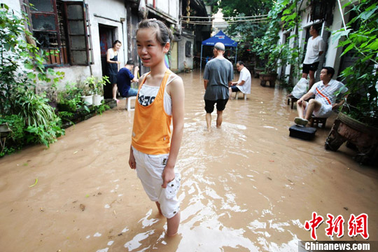 两江水位上涨,不少民居进水被淹,行走间水位已没至膝盖。图为市民们“水”中闲坐,静待洪水退却。 刘函冉 摄