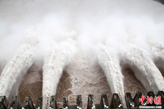 7月20日8时,峰值为7万立方米/秒的洪水抵达三峡大坝。这是三峡工程建成后的首次大规模洪峰。大坝共开启9个泄洪深孔,将洪水下泄流量控制在4万立方米/秒左右,削减了4成多的洪峰下泄流量。中新社发 刘良伟 摄