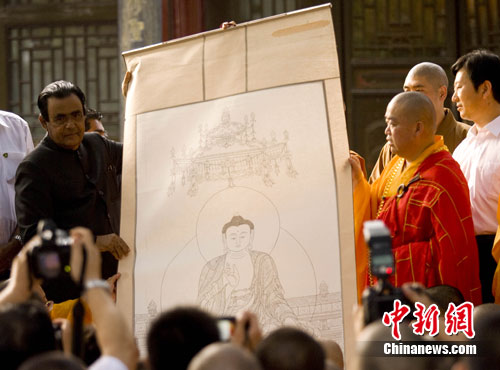 7月20日,斯里兰卡总理贾亚拉特纳接受少林寺方丈释永信赠送的释迦摩尼画像。当日,斯里兰卡总理贾亚拉特纳造访千年古刹少林寺。中新社发 王中举 摄