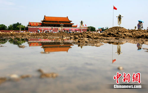 7月20日,北京天安门广场上新更换的土壤刚刚被浇过水,倒影中映出天安门和游人。天安门广场于近日对草坪进行更新,土壤全部被更换。天安门广场东西两侧的草坪面积合起来是9600平方米,象征中国960万平方公里的土地。 中新社发 苏丹 摄