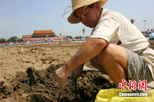 7月20日,一位园林工人在北京天安门广场整理土壤。天安门广场于近日对草坪进行更新。中新社发 苏丹 摄