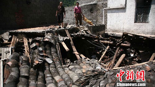 7月20日,四川达州、万源等地相继放晴,洪灾进一步缓解,灾民清淤工作全面展开,不少灾民将自己家中被水浸泡过的衣物、家具等拿到街上“晒太阳”。图为万源坪溪一农户在倒塌的房顶上铺晒洪水浸泡后的粮食。中新社发 张浪 摄
