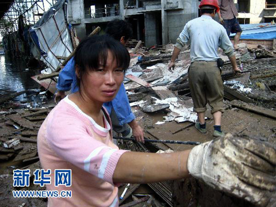 工人在被洪峰冲毁的国道318线渠江二桥工地清理。邓良奎 摄