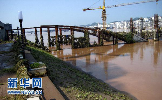 被洪水冲毁的国道318线渠江二桥的钢架桥梁。邓良奎 摄