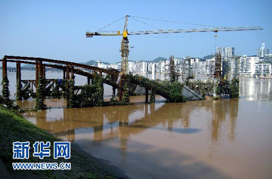 被洪水冲毁的国道318线渠江二桥的钢架桥梁。邓良奎 摄