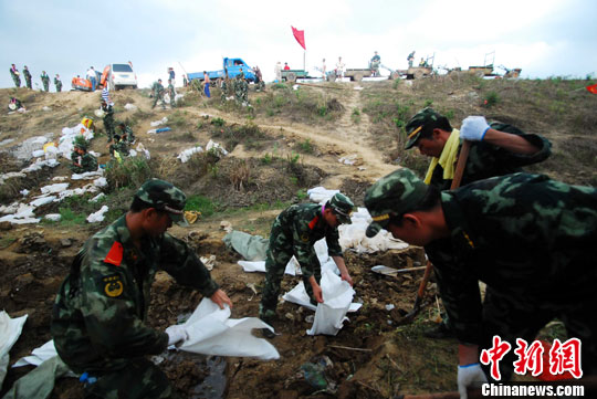7月20日,武警水电二总队的官兵与当地群众在江西九江彭泽县芳湖国有圩堤上开展抗洪抢险。当日,受持续高水位影响,九江彭泽县芳湖国有圩堤因蚁害发生塌陷,并同时出现了十多处管涌。胡国林 摄