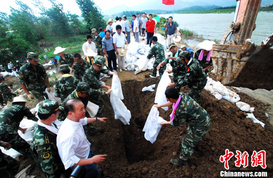 7月20日,武警水电二总队的官兵与当地群众在江西九江彭泽县芳湖国有圩堤上开展抗洪抢险。当日,受持续高水位影响,九江彭泽县芳湖国有圩堤因蚁害发生塌陷,并同时出现了十多处管涌。胡国林 摄