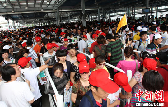 7月21日上午9时12分,上海世博会累计参观者突破3000万人次,达3000.8万人次。自7月5日至20日,上海世博会日参观人数已连续16天超过40万。图为参观者排队等候入园。中新社发 汤彦俊 摄