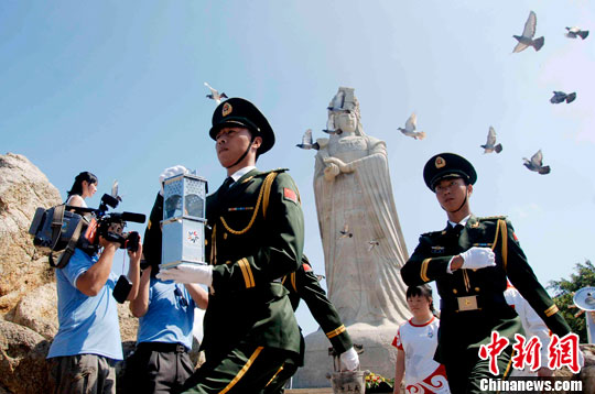 7月21日上午,中华人民共和国第五届特殊奥林匹克运动会圣火采集仪式在湄洲岛妈祖雕像前隆重举行。护卫队手捧火种灯走过妈祖雕塑。王东明 摄