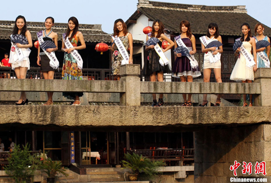 7月20日,正在浙江参加2010年国际旅游小姐中国区总决赛的34位佳丽来到西塘古镇拍摄外景。此次赛事采取六轮淘汰赛形式进行冠亚季选拔,并以栏目采取真人秀形式立体展示国旅及合作景区风采。图为参赛佳丽身著旗袍展示风采。中新社发 钱兴强 摄