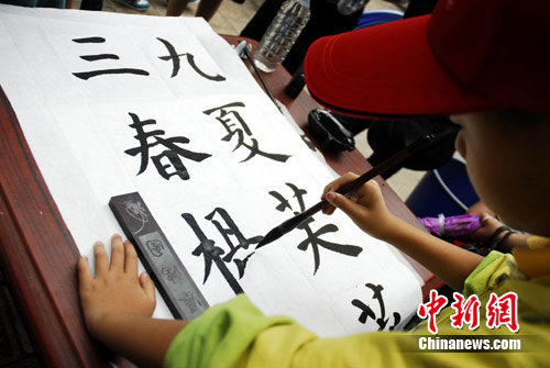 7月21日,昆明第三届少年儿童朗诵、书写大观楼长联比赛拉开帷幕。共有200名少年儿童参加比赛,当场书写、朗诵大观楼长联。图为参加书法比赛的小选手。 中新社发 田洪 摄