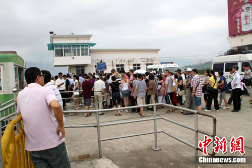 为应对20日8时来临的70000立方米/秒特大洪峰,至21日,三峡双线五级船闸已停航三天,难得闲下来的三峡船闸显得静悄悄。图为翻坝游客在秭归港下车乘船。上官纯青 摄