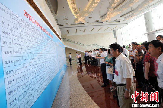 7月22日,出席中共福建省委八届九次全体会议的与会代表在会议间隙观看今年上半年福建省各社区市主要经济指标图表。当日举行的中共福建省委八届九次全体会议上披露的信息显示,今年上半年,福建经济在投资、工业生产、进出口、财政等方面都有上佳表现。中新社发 刘可耕 摄
