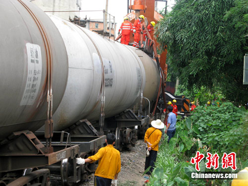 7月22日中午13时许,广西柳州市一列满载柴油的油罐火车行至鹧鸪江路一铁道口时发生脱轨事故,5节油罐车厢脱离铁轨。事故未造成人员伤亡,脱轨油罐车也未发生柴油泄漏。事故发生后,当地消防人员迅速赶到现场,对脱轨的油罐车进行冷却作业,以防高温引起爆炸。目前,铁路救援人员全部到位,正在加紧抢修该事故列车。据悉,发生事故线路为一冷库货运支线,未对铁路客运造成影响。