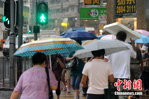 7月22日傍晚,特大暴雨袭击香港,估计局部地区会出现每小时雨量超过70豪米的暴雨,天文台发出最高级别的黑色暴雨警讯信号。图为路人雨中匆匆走过筲箕湾路口。 中新社发 郑祚声 摄
