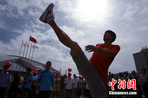7月22日,“全民健身志愿服务——奥运冠军、优秀运动员走进新疆”活动启动仪式在新疆体育中心举行,“飞人”刘翔与新疆体育爱好者进行互动活动踢毽子,其间刘翔长腿踢向高空,似要“展翅欲飞”。