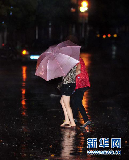 7月22日,广西博白县县城风雨交加,居民顶着风雨行进。黄孝邦 摄