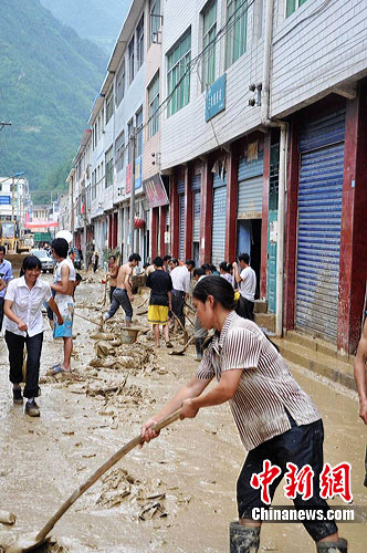 由于堰塞湖水位下降,庙坝桥头至罗江方向部分被淹房屋底层已“露头”。图为经专家鉴定为不是危房的房屋附近,灾民们已陆续开始了清淤,街面上随处可见被水淹没的物品。樊官勇 摄