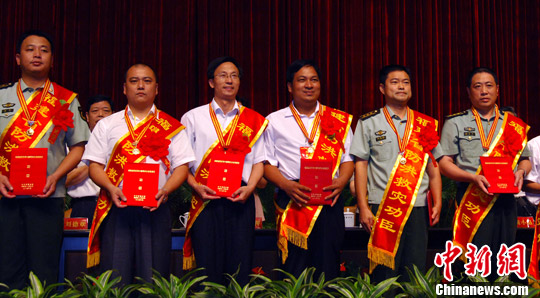 7月23日,福建隆重表彰防抗特大暴雨洪水抢险救灾功臣和先进集体、先进个人。武警福建省总队直属支队支队长王军等10人被授予“福建省防抗特大暴雨洪水抢险救灾功臣”荣誉称号,并有53个单位和235名个人被授予福建省防抗特大暴雨洪水抢险救灾先进集体和先进个人。中新社发 张丽君 摄
