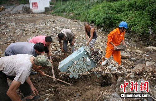 图为缺乏物资灾民人工将被埋的变压器挖出修复临时使用。中新社发 刘忠俊