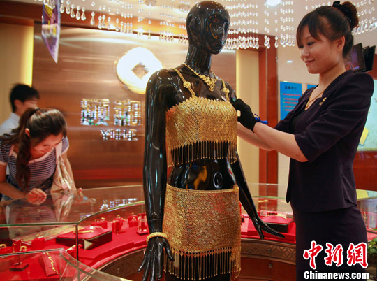 7月24日,据说中国首款“黄金衣”“黄金衣”在河北石家庄首次亮相。据工作人员介绍,展出的“黄金嫁衣”重3342.59克,由15位专业服装设计师精心手工打造,上下分体,其面料、丝线等所有材料都是纯金,价值100余万元人民币。据悉,该黄金衣还将在北京、天津等全国各大城市巡展。中新社发 翟羽佳 摄