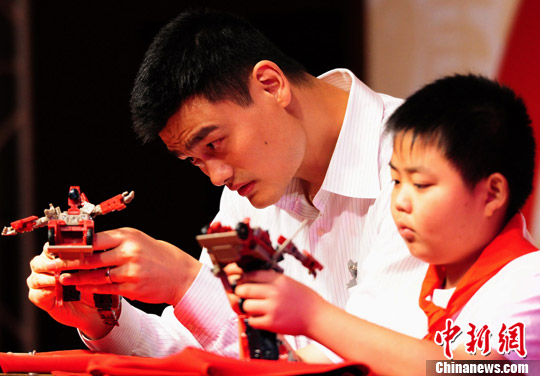 7月23日晚间,“2010北京姚基金慈善之旅”活动在北京举行,中国著名篮球明星姚明与四川广元市利州区雪艳——姚基金希望小学六年级学生段玉强PK组装变形金刚玩具,这令在球场上叱诧风云的“小巨人”颇感为难,最终败下阵来。中新社发 侯宇 摄