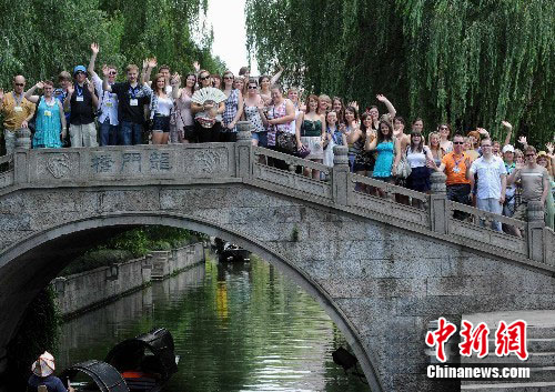 7月24日,英国的客人站在浙江绍兴老街的石桥上被古城美景所吸引,兴奋的纵情唱起歌来。中新社发 袁云 摄