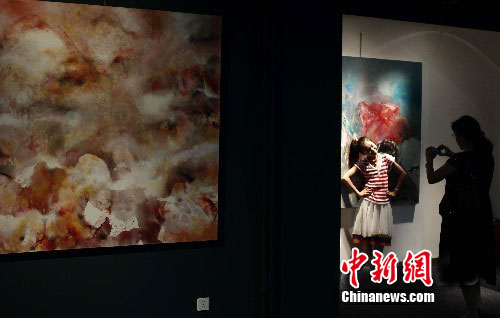 母女参观佛教艺术家赵文杰油画个人展览。中新社发 盛佳鹏 摄