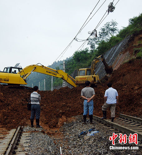 受7月23日晚特大暴雨影响,河南省西峡县境内发生多处山体滑坡,沪陕高速公路、312国道、宁西(南京-西安)铁路皆中断交通。中新社发 王中举 摄