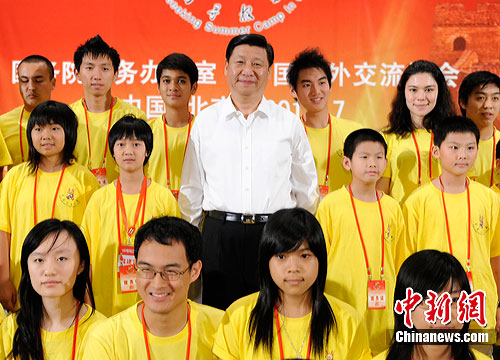 中共中央政治局常委、中国国家副主席习近平与参加夏令营的青少年合影。中新社发 廖攀 摄