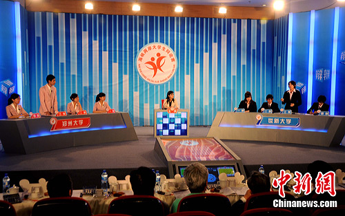 7月25日,第九届海峡两岸大学生辩论赛在福州决出团体前三名;郑州大学代表队、台湾世新大学代表队、福建师范大学代表队分获冠、亚、季军。为期三天、由福建省科学技术协会牵头联合福建省教育交流协会、台湾中华青年交流协会等两岸机构共同举办的第九届海峡两岸大学生辩论赛吸引大陆和台湾各选派8支高校代表队参加本届辩论赛角逐。图为当日获得本届海峡两岸大学生辩论赛团体冠、亚军的郑州大学代表队和来自台湾的世新大学代表队在决赛中就“一流大学是教师质量重于生源质量,还是生源质量重于教师质量”的辩论主题激烈展开“唇枪舌战”。