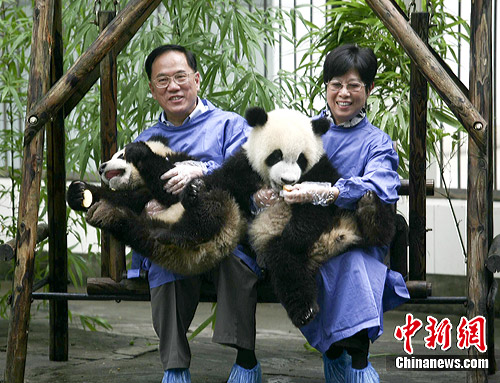7月25日下午,香港特区行政长官曾荫权率政府代表团抵达四川雅安。曾荫权携夫人、香港红十字会会长曾鲍笑薇在中国保护大熊猫研究中心雅安碧峰峡基地与大熊猫展开亲密接触。卧龙是香港特区政府援助四川重建的重点地区。汶川地震后,卧龙大熊猫研究中心61只大熊猫被转移安置到雅安基地。