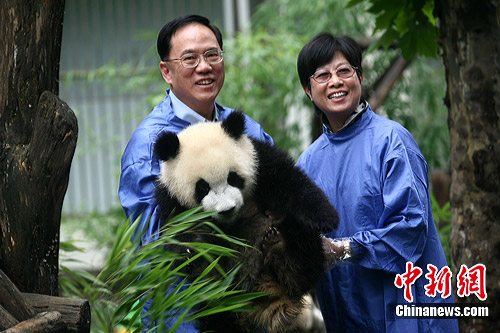 图:曾荫权夫妇在四川与大熊猫亲密接触(2)