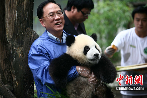 香港特首曾荫权四川拥抱大熊猫。中新社发 张浪 摄
