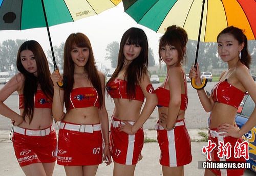 上万名前来现场观赛的车迷热情不减,众多美女前来助阵。中新社发 赵振清 摄
