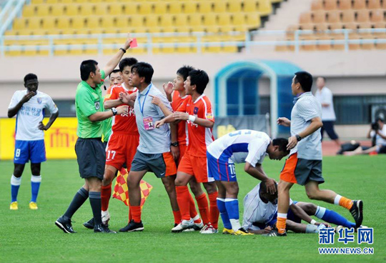 中超裁判三分钟出两红牌 球迷飞踹裁判 (2)