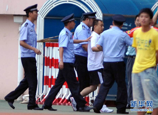 7月25日,与主裁判王哲发生肢体冲突的青岛中能队工作人员(左四)被警察带走。朱峥 摄