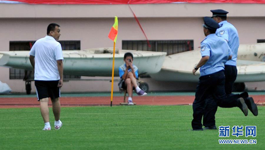 7月25日,两名警察跑向与主裁判王哲发生肢体冲突的青岛中能队工作人员(左)。朱峥 摄