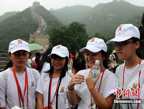7月26日,2010年海外华裔及港澳台地区青少年“中国寻根之旅”夏令营的营员来到长城和故宫感受祖国传统文化。几名印度尼西亚少女一起登北京居庸关长城。中新社发 廖攀 摄