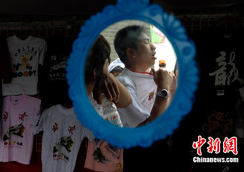 在北京居庸关长城上的旅游品销售部这些海外青少年纷纷在此避暑。中新社发 廖攀 摄