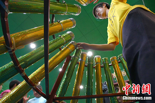 图为北京五中分校的创意环保乐队用羽毛球桶制成的打击乐演奏乐曲。中新社发 富田 摄