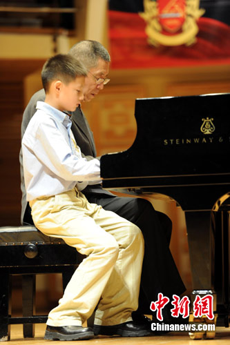 7月26日晚,两年一度的2010香港少年儿童钢琴大赛闭幕式暨获奖选手汇报演出,在香港文化中心音乐厅举行。图为世界钢琴大师刘诗昆即兴与获奖选手鞠小夫(南京),联手弹奏贝多芬《变奏曲》。 中新社发 郑祚声 摄
