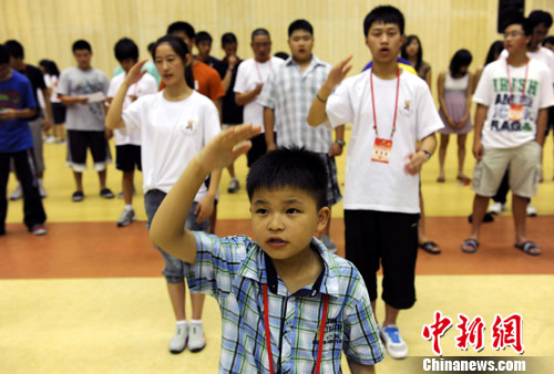 7月26日晚,海外华裔及港澳台地区青少年营员在驻地加班排练联欢晚会的节目。图为抗震小英雄林浩和来自各国的营员们排练节目。27日晚,2010年“中国寻根之旅”夏令营将在北京国家体育馆举行闭营仪式和联欢晚会。 中新社发 刘震 摄